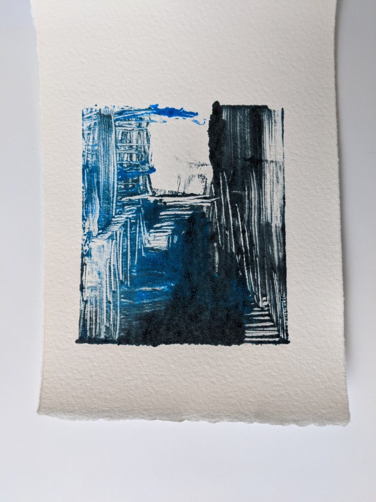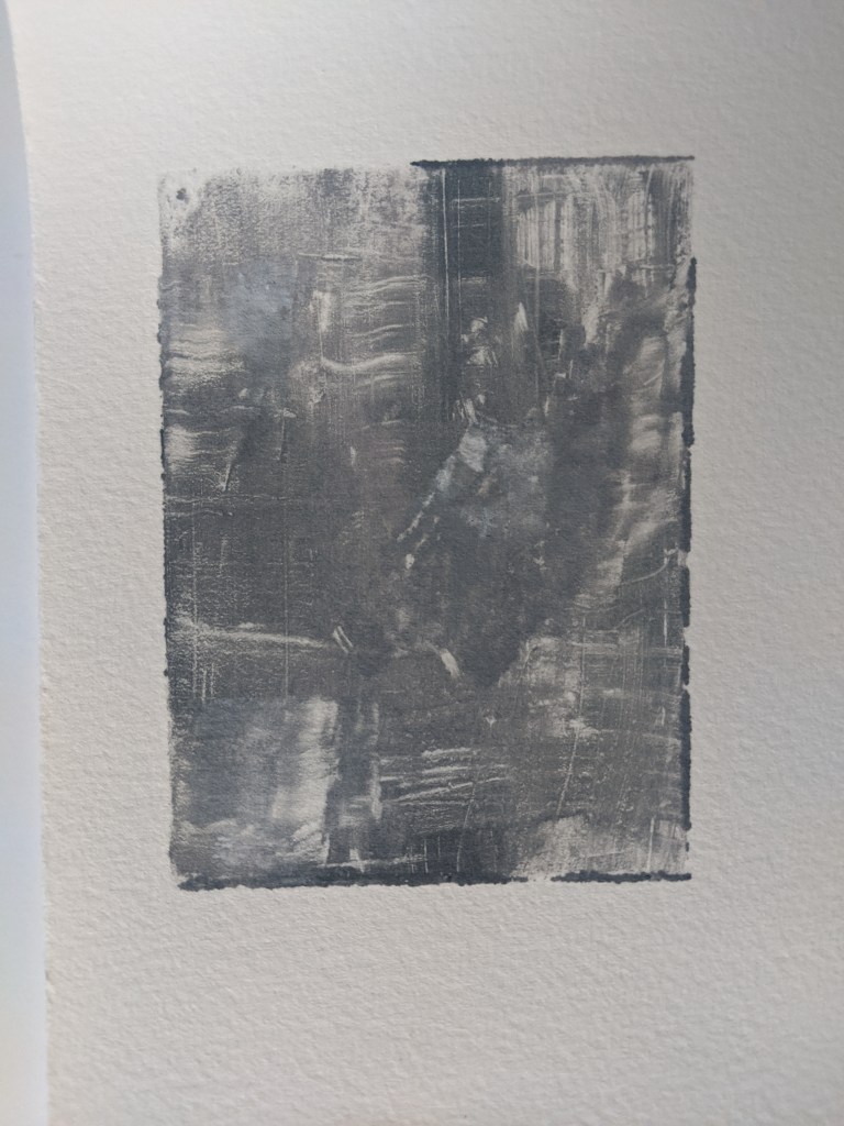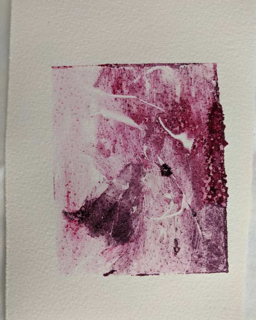 These little monotypes capture the moment of a song. I have to work fast before the ink dries on my plexiglass plate. It’s a gut reaction that can only exist once. In other words, it’s an edition of one, one-of-a-kind, cannot be reproduced image.